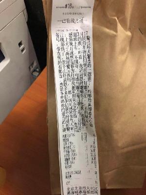 只见一张宽5厘米、长25厘米的外卖单上,密密麻麻这个若干行字,上面写着:"感谢3月17号晚上值班的民警,那天晚上我自己带孩子开车,车坏在了高速上,吓得大哭,虽然不在民警的管理范围,但是民警听我哭的那么厉害,一直打电话安慰我。真的很感恩,很感恩,我当时好了很多,真的很感恩!我不知道你姓什么,但是当时你给了我很大的勇气,让我安心!好人有好报,谢谢警察同志!!"